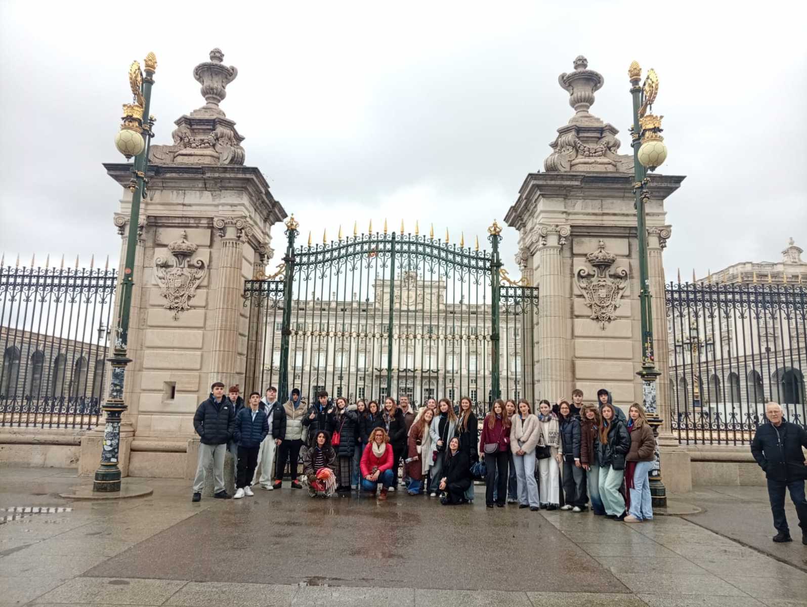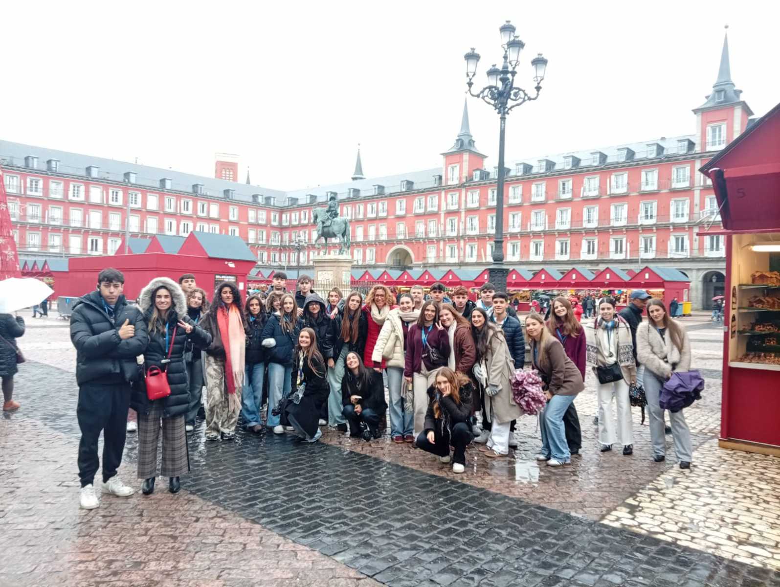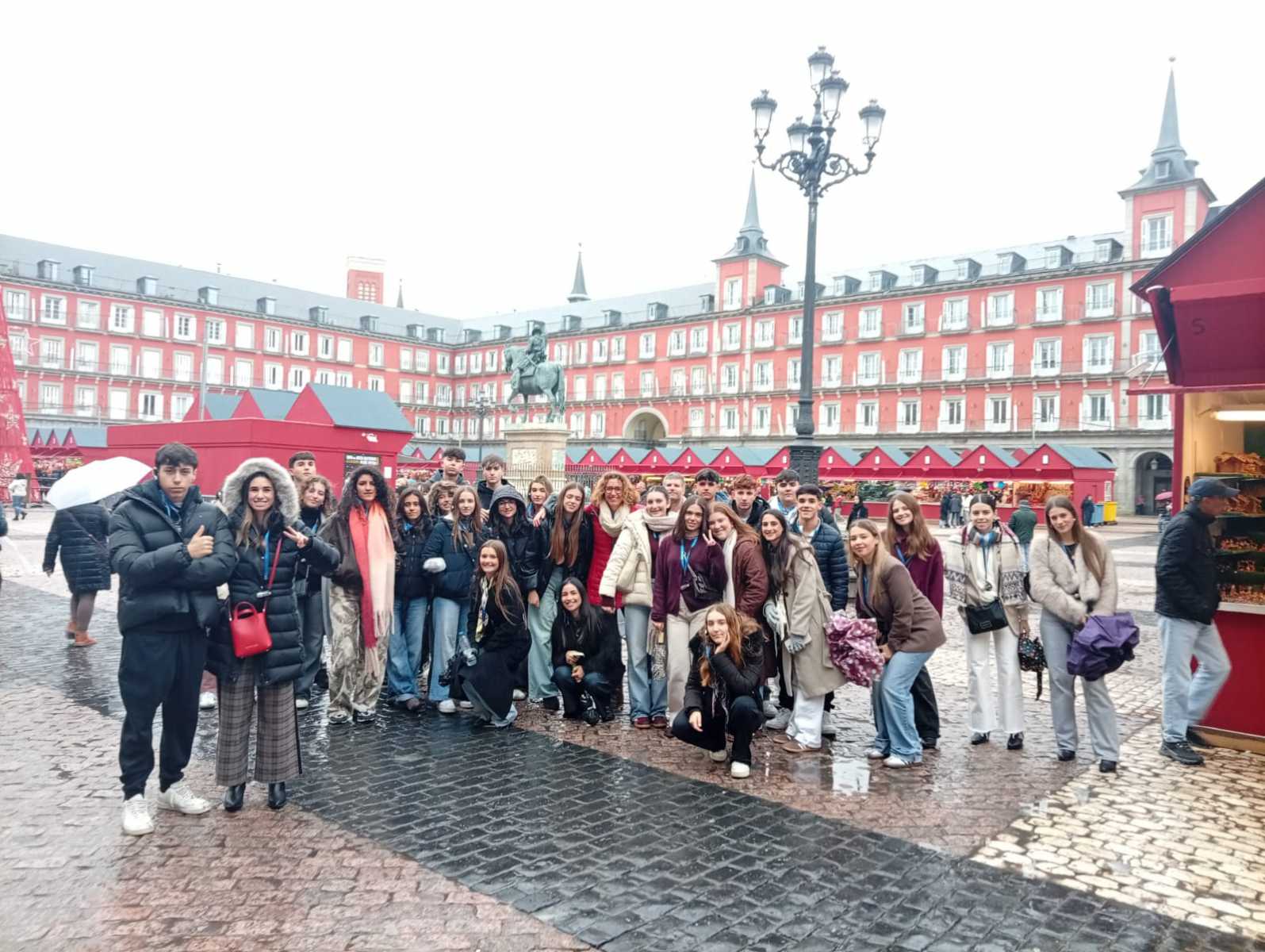 En el segundo y último día por Madrid, el alumnado de 2º de Bachillerato ha visitado por la mañana las calles del casco histórico y sus sitios más emblemáticos, como la Puerta del Sol, el Palacio Real, la Catedral de la Almudena y Plaza Mayor. En este último, los estudiantes han visitado el Mercadillo Navideño, donde han hecho unas compras para sus respectivas casas. Por la tarde, alumnado y profesorado han disfrutado de una cálida merienda todos juntos y para finalizar, han realizado un paseo por el famoso Parque “El Retiro”.