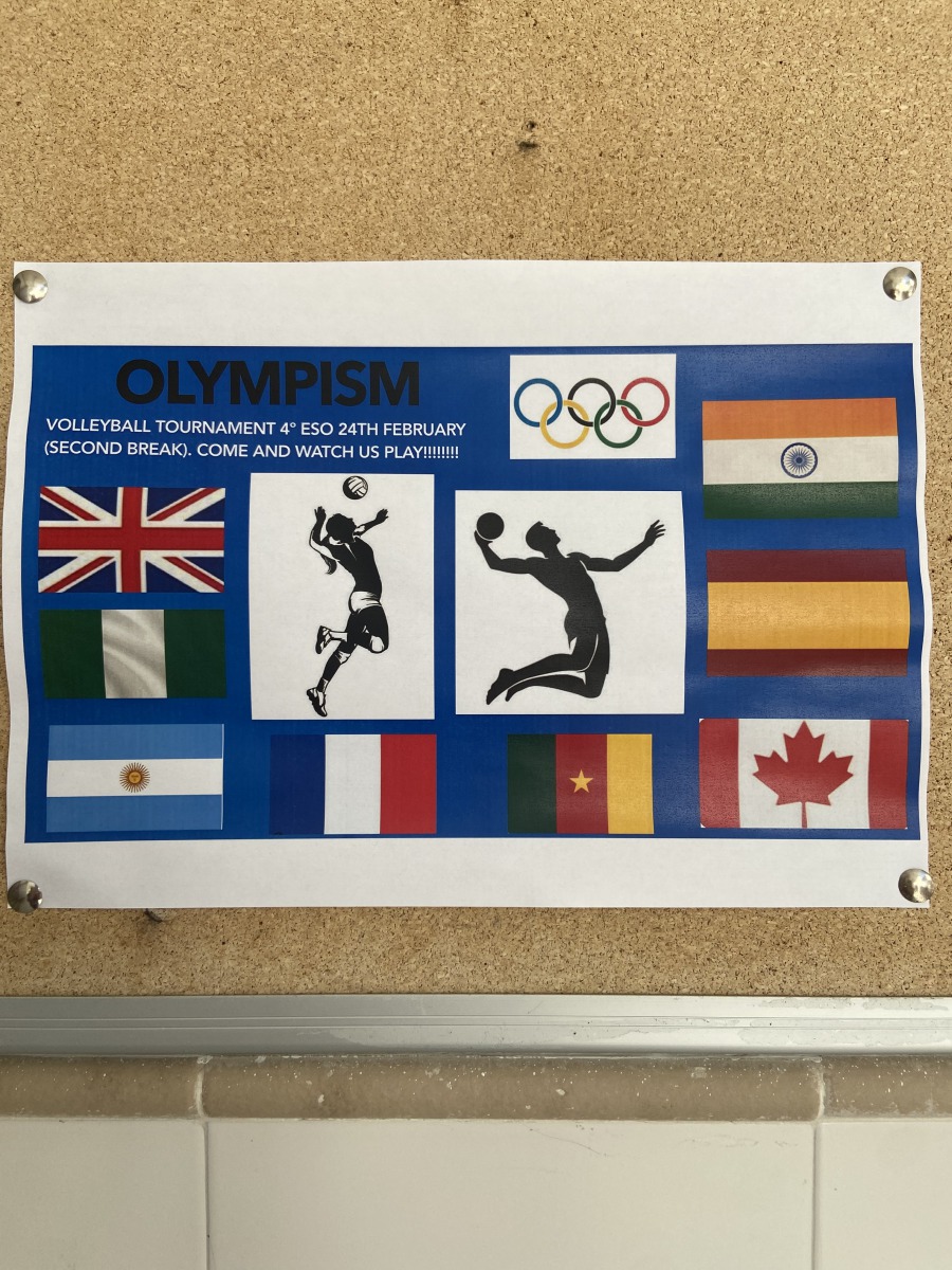Students of 4º ESO, as players from different countries ( Spain, Britain, France, Canada, Argentina, India, Cameroon and Nigeria), participated in a volleyball competition organized by the PE department. They played really hard, respected the rules and followed the olympic spirit. Spain came first (gold medal), France second (silver medal) and Canada came third (bronze medal). The students really enjoyed the game!!!!